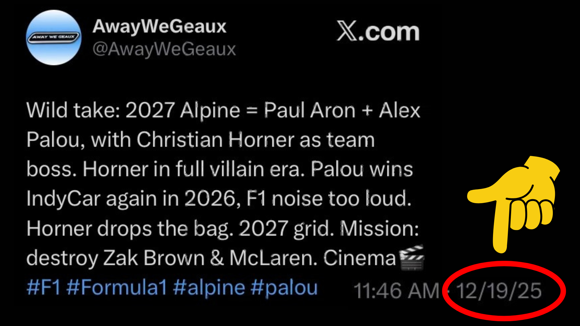 Christian Horner needs a golden boy—or a golden girl. At the moment, that driver is Alex Palou. There is no more prominent, more proven name in motorsport outside of Formula One. No other name carries the same weight: four IndyCar championships and a win in the opening race of the 2026 season. Every victory Palou racks up this year, the noise around F1 will grow louder and harder to ignore.